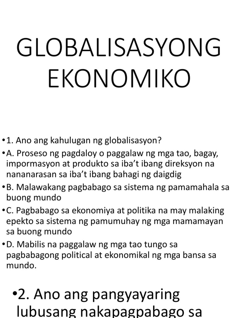 4 sa halos bawat bansa maunlad man o mahirap lalong lumalawak ang agwat ng. NAGBIGAY DAAN SA EPEKTIBONG UGNAYAN NG MGA BANSA NA NAGDUDULOT NG MABILIS NA PALITAN NG MGA PRODUKTO. Itoy isang phenomenon na nagsimula nang matagal na panahon subalit nagiging mahalaga ito sa mga huling dalawang siglo.