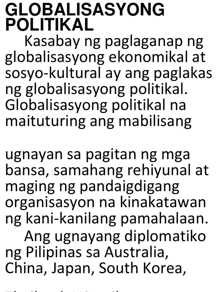 Sa kahulugan na ito ang prosesong ito ay sinasabing gumawa ng mundo bilang isang pandaigdigang nayon. Ang termino ay nagmula sa Latin politicus at ang salitang ito mula sa Greek politik. 3 malawak pa rin ang agwat sa pag-unlad ng pinakamayayamang bansa at ng pinakamahihirap na bansa tingnan ang Pigura 1.
