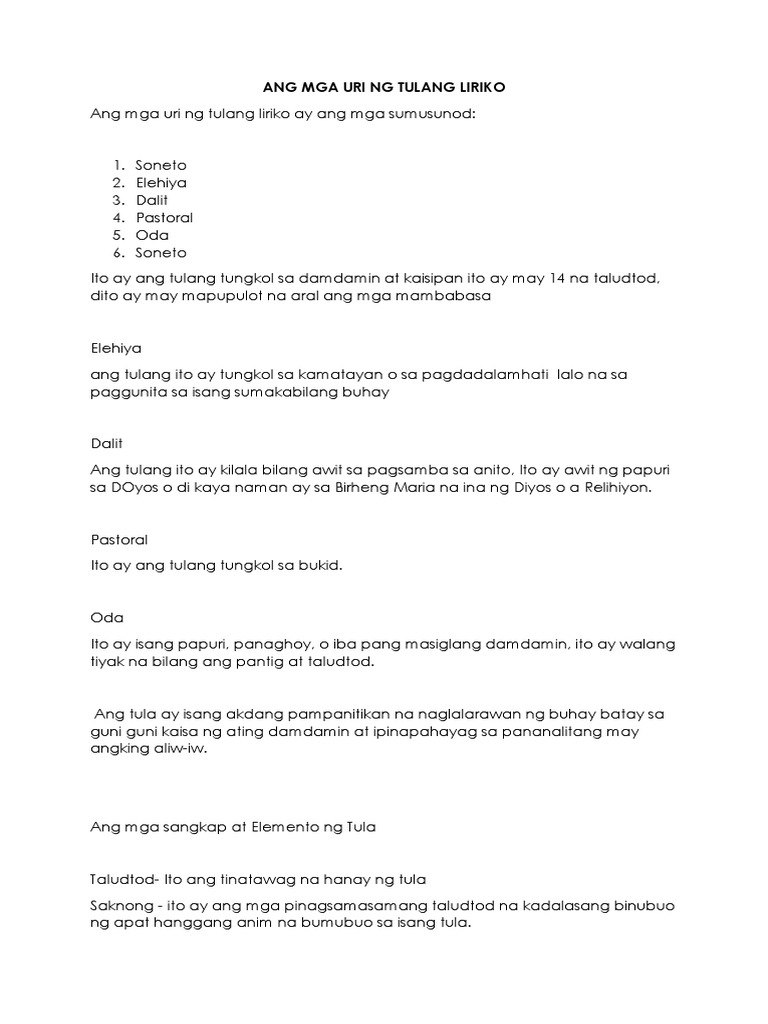 Uri Ng Tulang Liriko Pdf. Manggagawa ni Jose Corazon de Jesus. Depinisyon - Tagalog Lang.