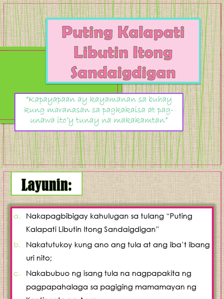 10282019 GAWAIN SA PAGKATUTO 2. 9152013 Bayani ng Bukid Akoy magsasakang bayani ng bukid Sandatay araro matapang sa init Hindi natatakot kahit na sa lamig Sa buong maghapon gumagawang pilit. 982015 Ang damdaming nangingibabaw sa tulang Bayani ng Bukid.