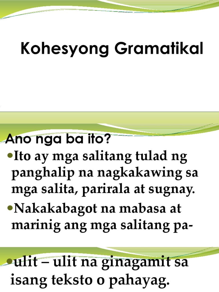 Ano ang kahulugan ng kohesyong gramatikal. Nakababagot na mabasa at marinig ang mga salitang paulit-ulit na ginagamit sa isang texto o pahayag. Kohesyong Gramatikal Cohesive Device Reference Cohesive Device Reference o kohesiyong gramatikal ay nagpapatungkol sa mga salitang nagsisilbing pandanda upang hindi maging paulit-ulit ang mga salita. MGA URI NG PANANDANG GRAMATIKAL 1 Reference o Pagpapatungkol- ito ang paggamit ng mga panghalip na tumutukoy sa mga nauna o nahuling pangalan.