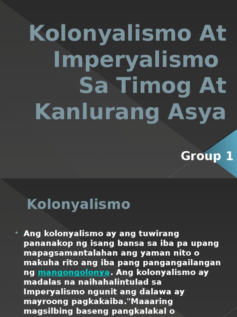 Human translations with examples. 2017-06-11 Ang kolonyalismo ay ang tuwirang pananakop ng isang bansa sa iba pa upang mapagsamantalahan ang yaman nito o makuha rito ang iba pang pangangailangan ng mangongolonya. Isulat ang inyong kasagutan sa ibabaMahalaga ang mga ito sa ekonomiya ng bansa dahil angPag-iimpok123Pamumuhunan123.