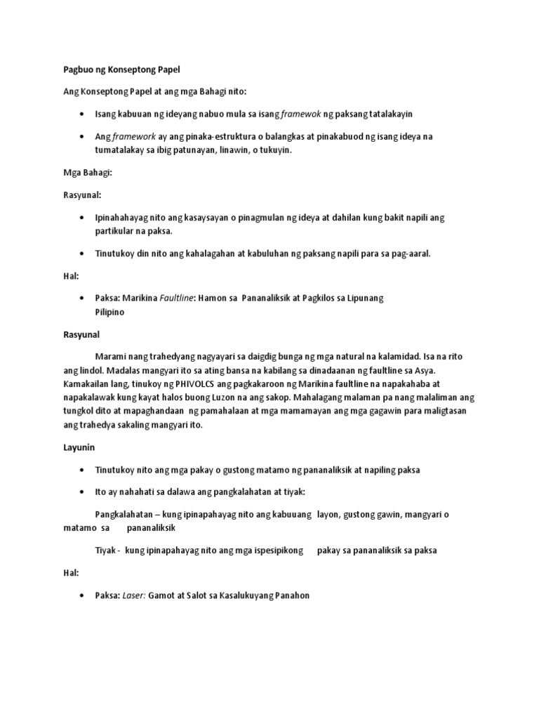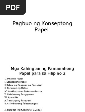 Bago pa man kasi niya gawin ang malalimang pagsisiyasat o pagpapatunay sa pamamagitan ng mga nakalap na ebidensiya ay magkakaroon na siya ng pagkakataong maipakita o mailahad kung ano ang. Nakaugat sa tagumpay ng pananaliksik ang mga simulain at hakbang kaugnay ng pagbuo ng komprehensibo at epektibong konseptong papel. ANG KONSEPTONG PAPEL Mula sa nabuong paksa pahayag ng tesis at balangkas ay maaari na ngayong bumuo ng konseptong papel.