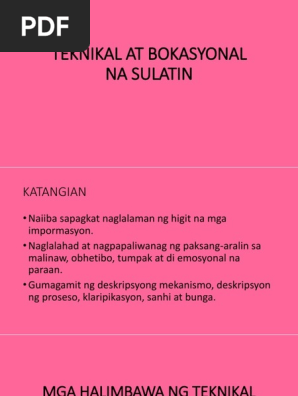 03-07-2016 Ano ang kahalagaan ng Teknikal bokasyonal na pagsusulat. Ito rin ay gumagamit ng deskripsyong ng mekanismo deskripsyon ng proseso klaripikasyon sanhi at bunga paghahambing at pagkakaiba analohiya at interpretasyon. 21-06-2017 Teknikal-Bokasyonal na SulatinKahulugan ng Teknikal-Bokasyonal na SulatinAng sulating tecknikal ay isang uri ng komunikasyon sa ano mang larangan na ang pangunahing gampanin ay makalikha ng isang tiyak at partikular na impormasyon sa tiyak ding layunin sa partikular na mambabasaIto ay obhetibomalinaw at tumpakat di emosyonal na paglalahad ng.