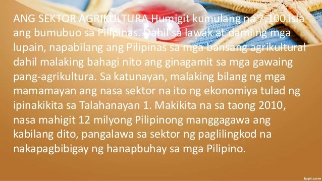 2Biniyayaan ang bansa ng mayamang lupain kaya maraming uri ng mga pananim ang maaaring patubuin at pagyamanin ito 3Ang mga pangunahing produkto sa pagsasaka batay sa bigat ng ani ay tubo niyog palay mais saging kape at abaka. Kung walang pagkain walang yamang tao na magpapatakbo ng mga makinarya o magpapatakbo ng lipunan. Dec 17 2013 Sektor ng Agrikultura 5.